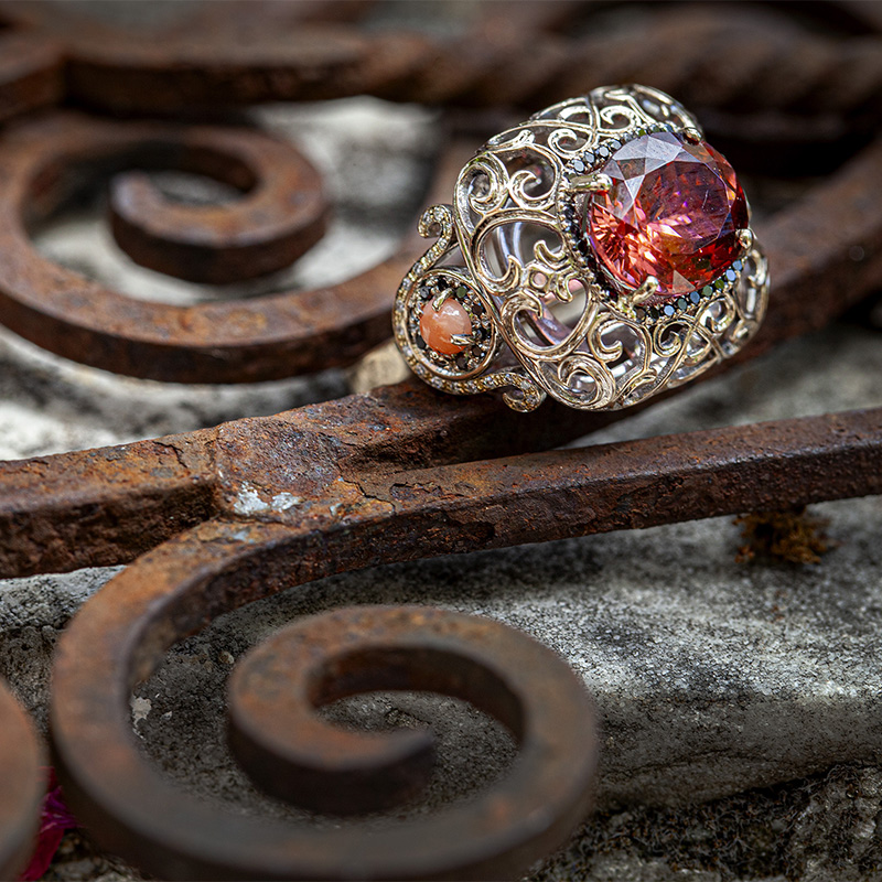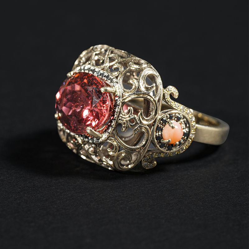 Oro bianco 750 kt, tormalina, diamanti neri, diamanti bianchi, corallo.
